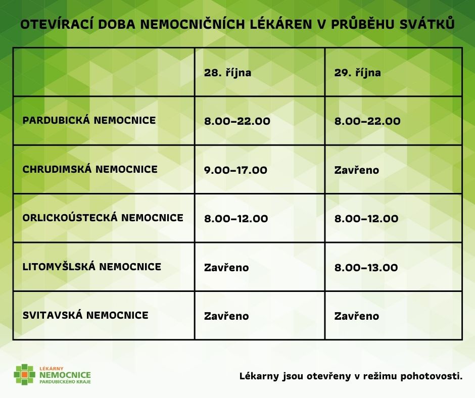 Během následujícího víkendu budou mít lékárny Nemocnice Pardubického kraje upravenou dobu viz obrázek níže.