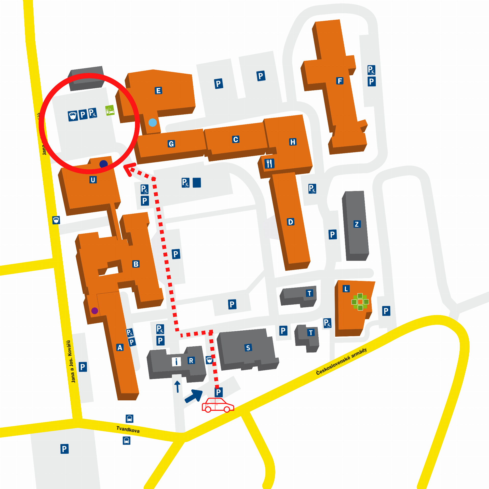 Pacienty i další návštěvníky prosíme, aby využívali parkoviště před vstupem do budovy urgentního příjmu. Projet na toto parkoviště mohou řidiči vnitřkem areálu nemocnice (viz mapu).